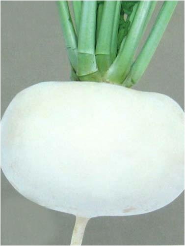 ●耐病性にすぐれ、特にウイルス病に強い。 強勢で太りが早く、小〜中〜大かぶと市場の要求に合わせて収穫のできる栽培容易な万能種。 ●形は早くから整い、豊円でそろいが極めてよい。 肌は純白でツヤがあり、ス入りや根割れの心配はない。 ●特に夏まきの小〜中かぶ栽培、秋まきの覆下栽培、冬まきのトンネル栽培、春まきの露地栽培などに好適する。