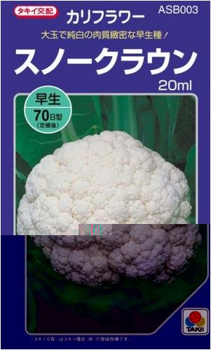 ●草姿はやや開張性。 草勢旺盛で耐病性強く、栽培が容易。 ●熟期は、適期栽培で定植後約70日で収穫できる早生種。 ●花蕾は均斉のとれた純白の大玉で、肉厚く、品質は早生種中で最高。 そのうえ、花蕾が緻密にしまり、収穫期の幅は広い。 ●花蕾の直径16cm、花蕾重850g内外によくそろう。 ●温度に対して鈍感で、春作でのボトニングの懸念も少なく、秀品率が高い。