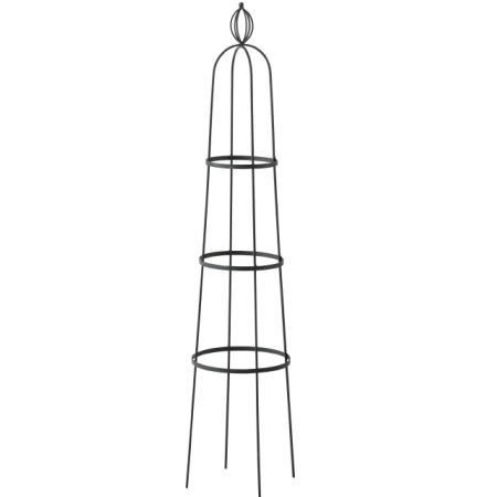 黒いオベリスク 黒いオベリスクを探していました。クレマチスを這わせます。足を埋め込んで設置したらちょうどよい高さでした。組み立ては簡単でリングに植木鉢を乗せることができるのでいろいろな使い方が出来そうです。リングとてっぺんのギボシはスチールではなくてポリプロピレンです。何よりも価格が安いです。
