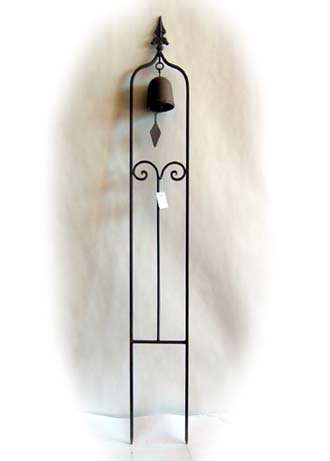 ベルのついたユニークな形の細長いトレリス。風になびいてベルが鳴ります。 アイアンの優雅な曲線が植物の美しさを引き立てます。鉢土や地面に差し込んでご利用ください。